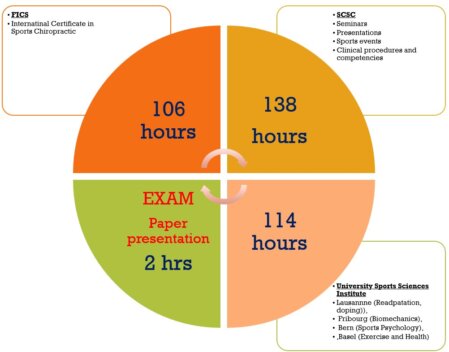 The Module 2 of this complementary sports education will need an extra 200h of sports education to fulfill the 300h formation required by the Swiss Chiropractic Academy for the obtention of a ChiroSuisse Complementary Certification. A suggested possibility to cumulate 200h after the 100h already obtained from the ICSC program, would be 100h practical experience (out-of-clinic sport experience, maybe also case study and/or peer group presentations) and another 100h through 6-8 additional seminars and/or courses in collaboration with the Swiss Association of Sports Medicine.